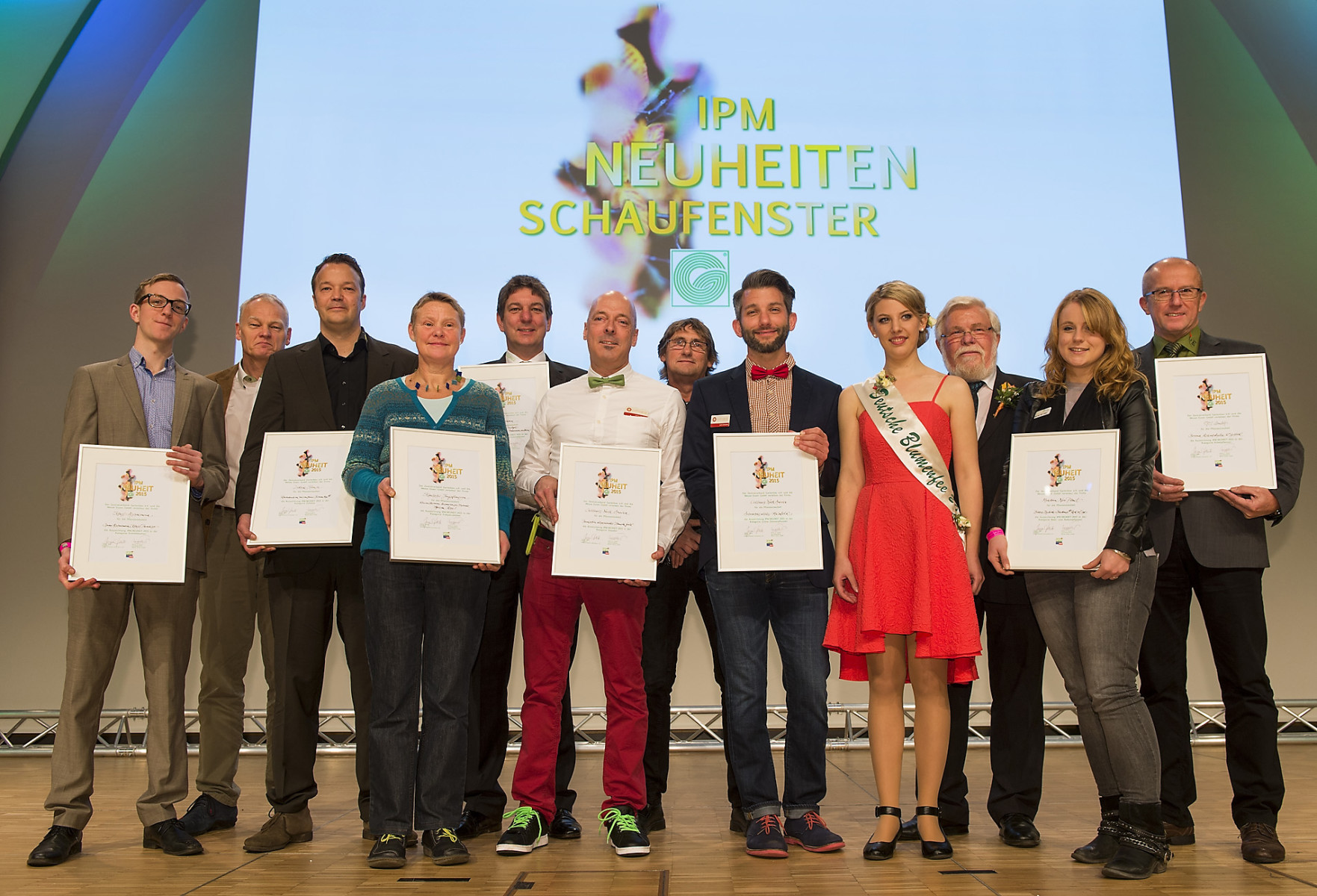 Die Sieger des IPM-Neuheitenschaufensters stehen fest. Die Urkunden übereichten Heinrich Hiep, Vorsitzender des Bundesverbandes Zierpflanzen, und die Deutsche Blumenfee 2014/2015 Christina Aumann im Rahmen der Eröffnungsfeier der IPM ESSEN.