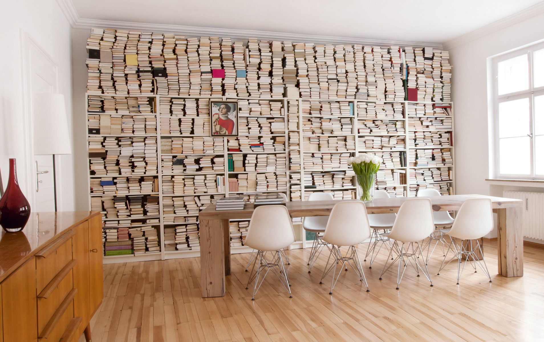 Wer nun immer noch Inspiration sucht, um in punkto Buchaufbewahrung mal etwas mutiger zu werden und hierfür auch gern mal bei anderen durchs Schlüsselloch sieht: In „Vom Glück mit Büchern zu Leben“ haben Stefanie von Wietersheim und Claudia von Boch 20 leidenschaftliche Büchermenschen porträtiert. Hier erfährt man zum Beispiel, dass Oliver Jahn, Chefredakteur der AD Architectural Digest, sie alle flachgelegt hat. Die Bücher natürlich. Um die 8000 Exemplare umfasst seine Liebhabersammlung, die sich nicht nur in, sondern auch bis unter die Zimmerdecke gestapelt auf den Bücherregalen befinden. Und mit dieser tollen Idee sind praktischerweise auch gleich alle Argumente aus dem Weg geräumt, wenn man in der Buchhandlung mal wieder nicht am wunderschönen Bildband oder dem so spannend klingenden Roman vorbeigehen konnte..!