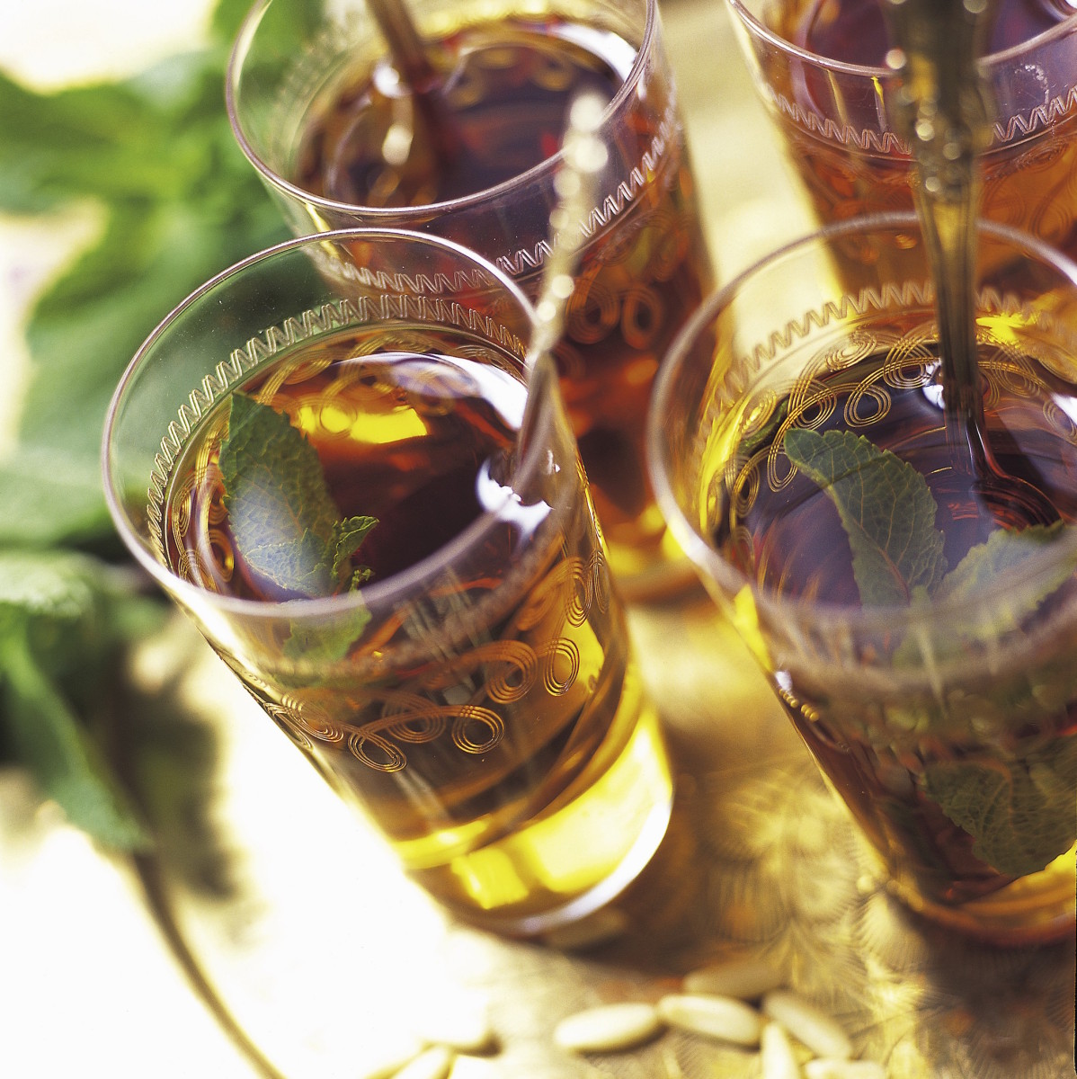 Der schwarze Tee mit Minze wird in orientalischen Gläsern serviert