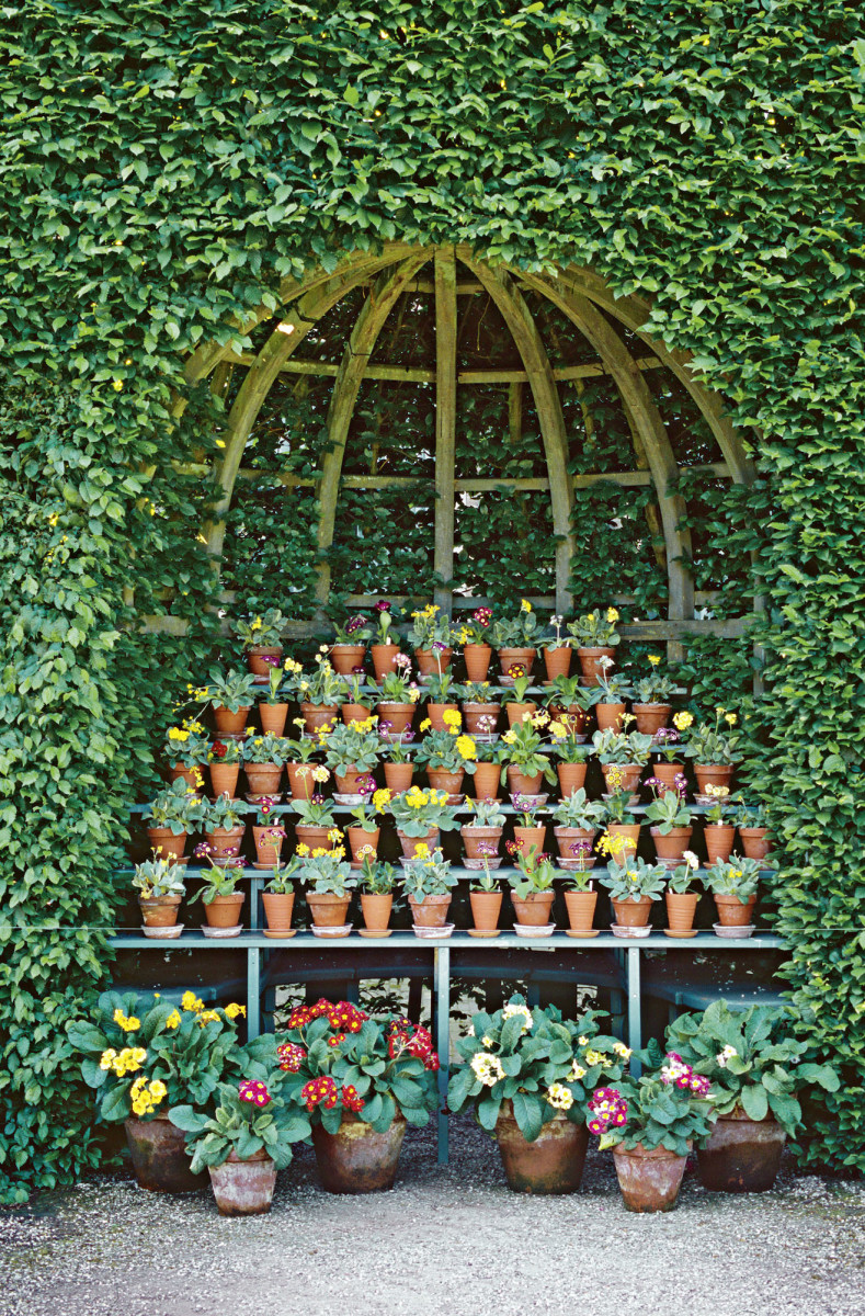 Die Aurikel ist eine Lieblingsblume der Queen, und auch viele andere Besitzer großer Landhäuser schmücken ihre walled gardens mit so genannten Aurikeltheatern. Das größte mir bekannte Aurikeltheater steht bei Lord Rothschild in Waddesdon Manor, das im April und Mai auch der Öffentlichkeit zugänglich gemacht wird. Auf jeder seiner etwa zehn Etagen befinden sich über 150 Sorten dieser Gattung.