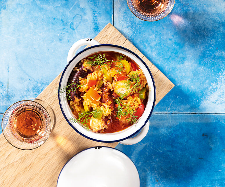 Im Restaurant Ponto Final aß Tim Raue das erste Mal Meeresfrüchte-Caldeirada und war restlos begeistert. Sie war wärmend, hatte die Konsistenz eines Reiseintopfs und die Salzigkeit des Meeres. Seine Version mit Pulpo ist etwas für kalte Tage, an denen die Sonne Portugals den Magen und die Seele im kalten Deutschland wärmen muss!