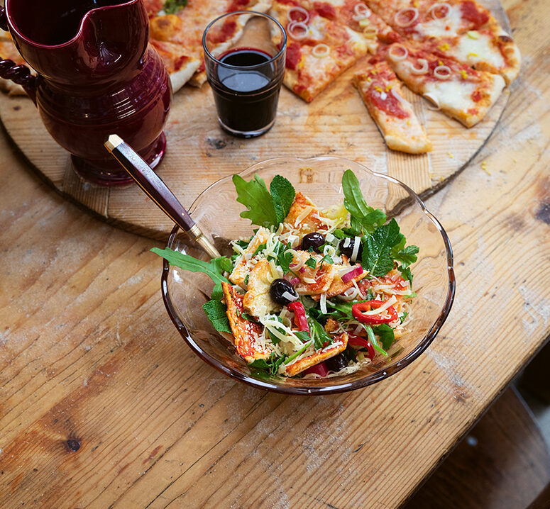 „Dopo la Festa“: Wir chillen beim Aufräumen, lachen beim Einräumen der Spülmaschine, jeder Teller, jeder Topf, jedes Gewürz wandert in einer oft geübten Choreografie zurück an seinen Platz. Meistens bekommt dabei irgendjemand noch einmal Hunger, improvisiert mit den Resten im Kühlschrank noch einen Mitternachtssnack und macht uns damit alle rundum glücklich. Und genau das ist die Inspiration hinter diesem toskanischen „Pizzasalat“.