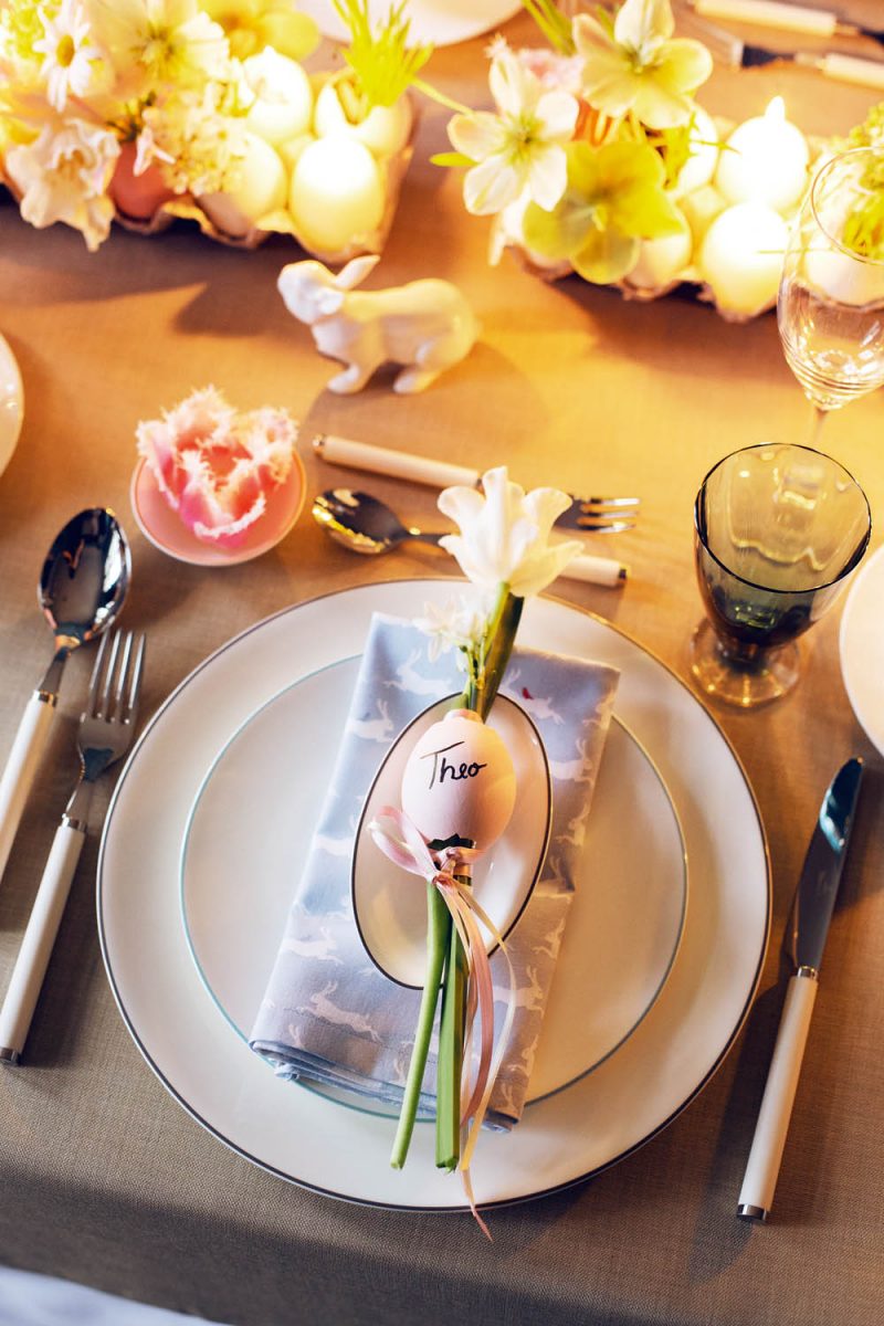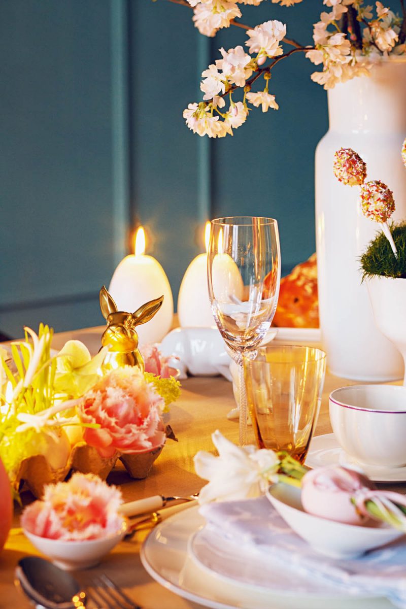 Hersteller: Geschirr „Fine Bone China“ von Dibbern, Besteck von Villeroy & Boch, Stoff Osterserviette von Gütermann, goldener Hase von Fürstenberg, Gläser von Poschinger