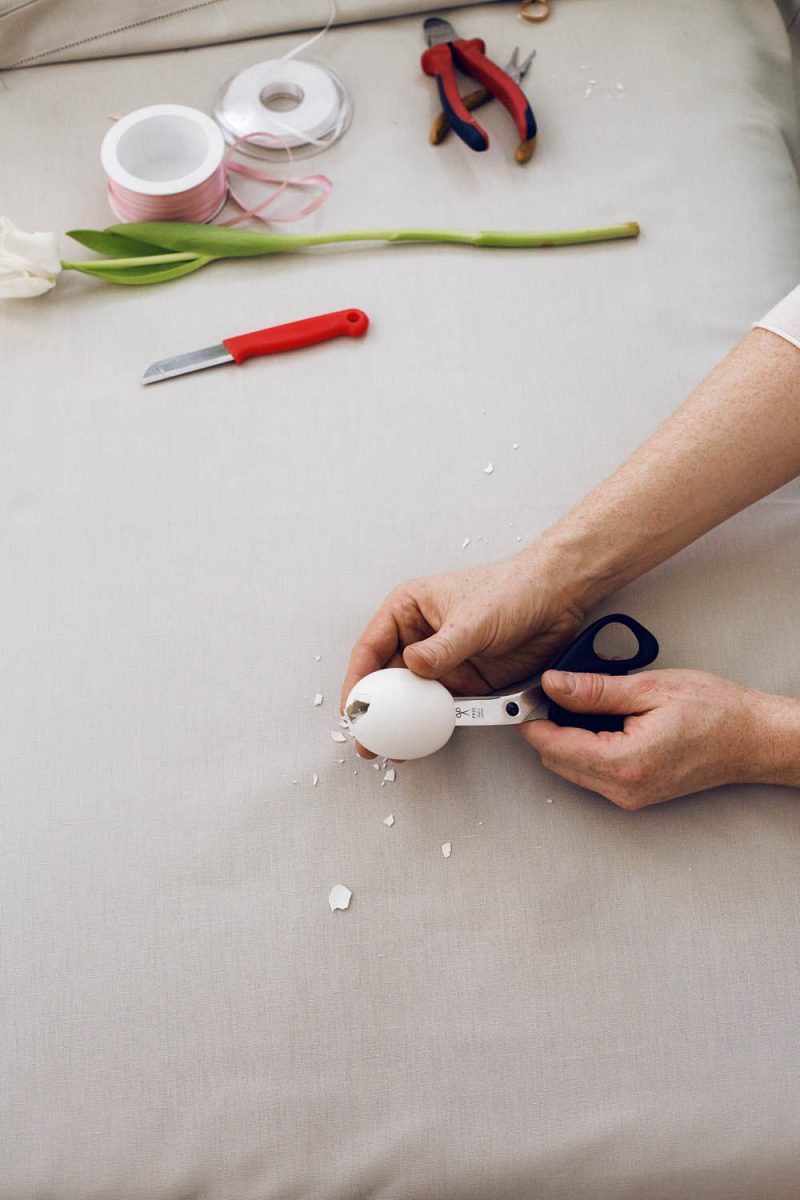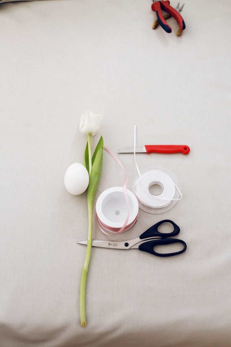 Du brauchst: Eine Tulpe, ein ausgeblasenes Ei, ein scharfes Messer, rosa und weißes Satinband, eine Schere