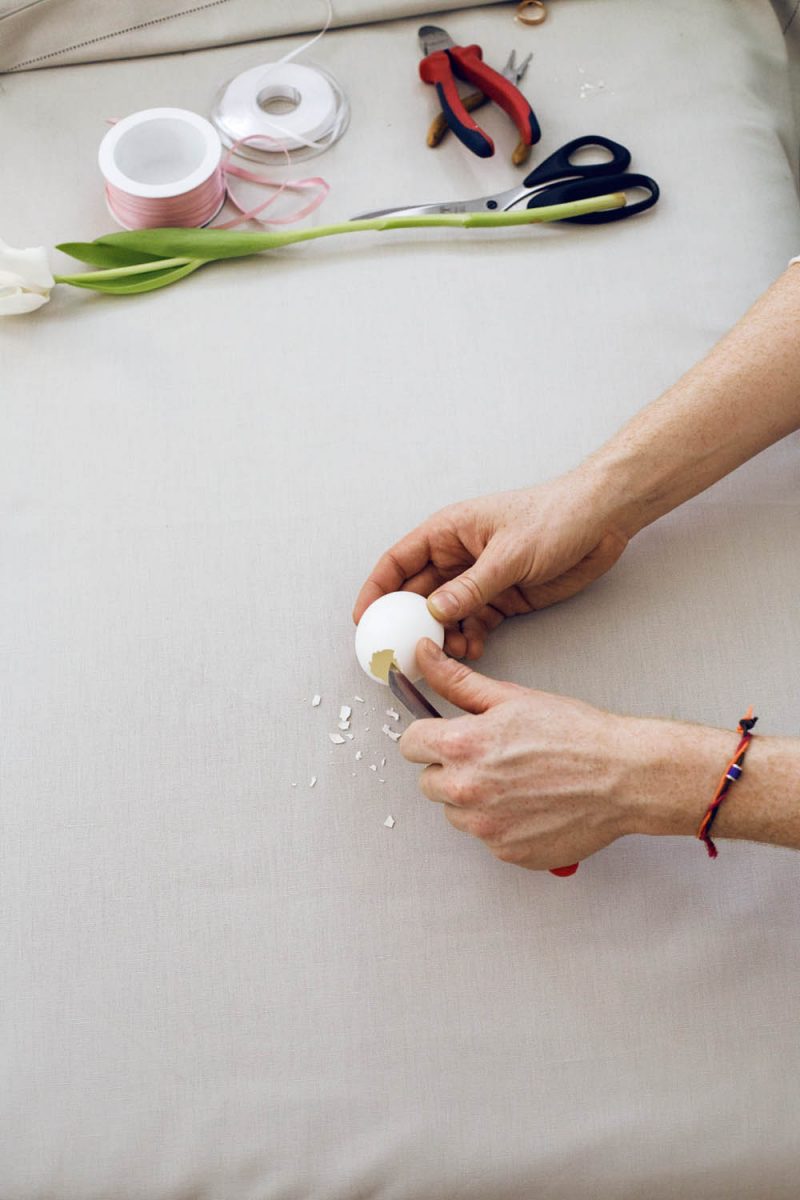 Mit dem Messer vorsichtig die Löcher des ausgeblasenen Eis vergrößern, sodass der Tulpenstiel mit Blatt hindurchpasst