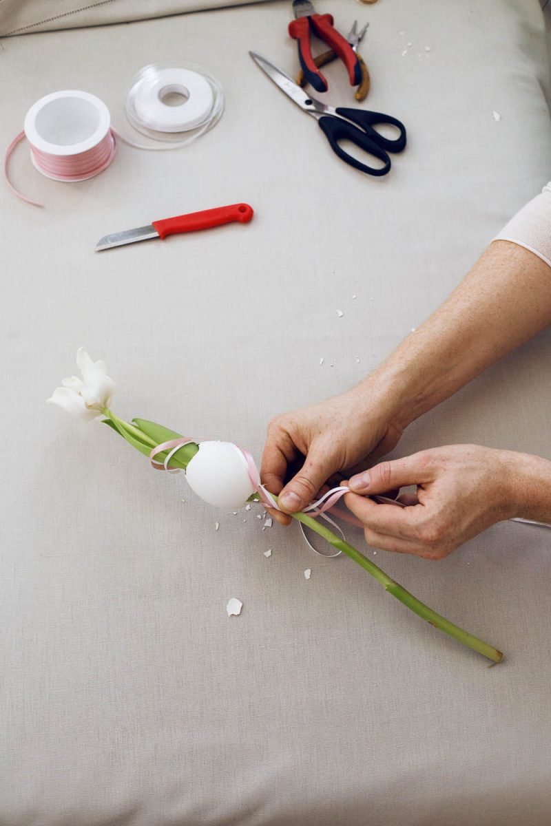Auf der Unterseite des Eis die beiden Schleifenbänder um den Tulpenstiel Knoten und nach oben führen, dort um den Stiel wickeln und zurück nach unten führen
