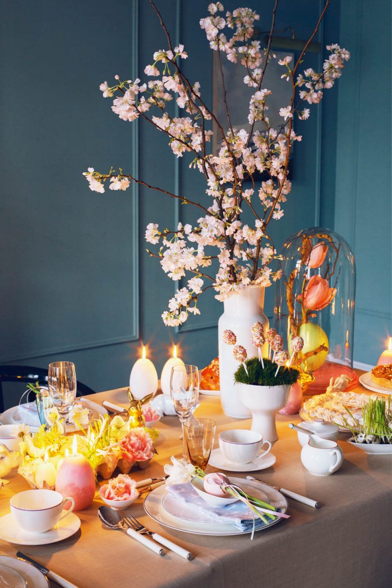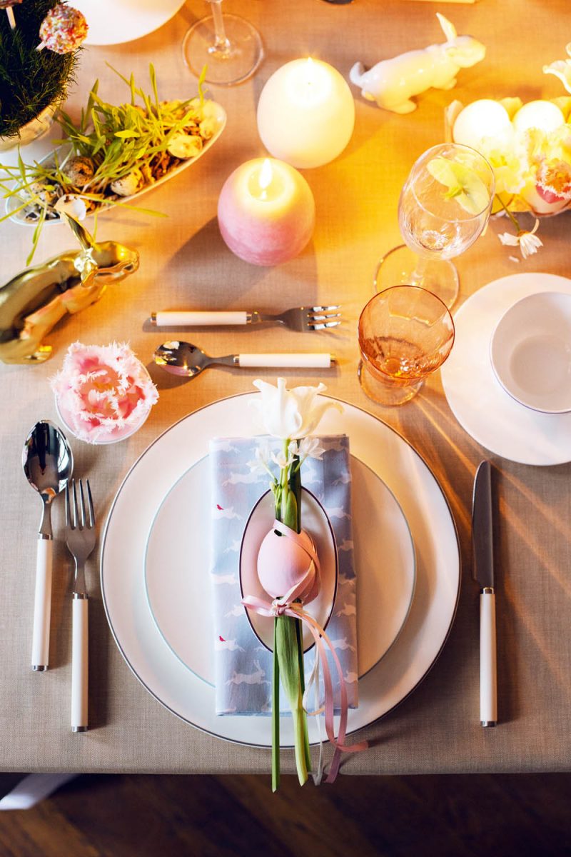 Klassische Bestandteile wie Eier in Pastelltönen, Tulpen und Osterkerzen verleihen dem Tisch Stil
