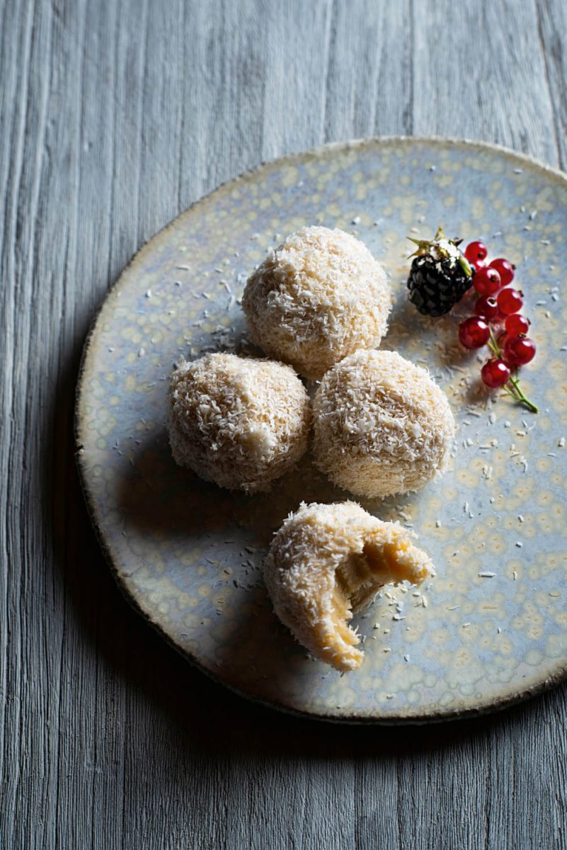 Die verrührte Masse mit den Händen zu etwa 10 bis 20 kleinen Kugeln formen und in den Kokosraspeln wenden. Für mindestens 60 Minuten in den Kühlschrank stellen, damit die Kugeln fest werden.