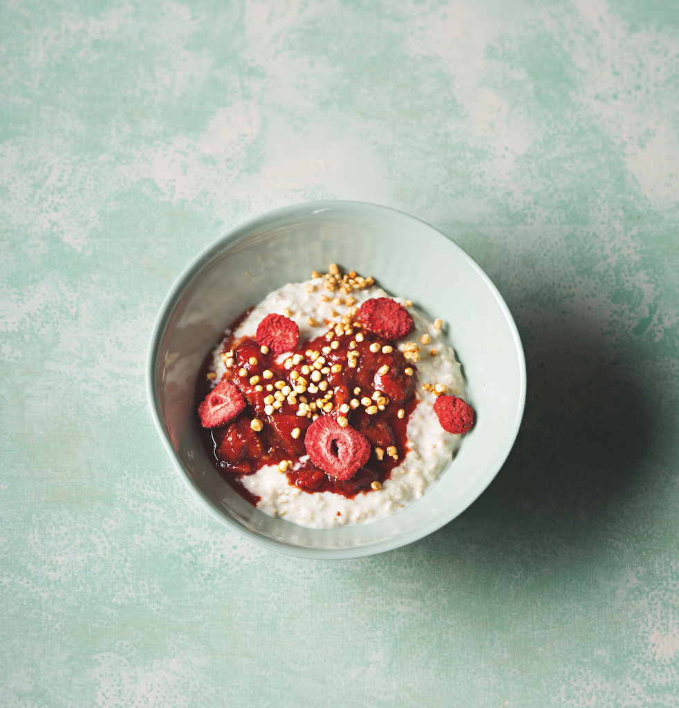 Kokosblütenzucker mit 100 ml Wasser in einem kleinen Topf aufkochen, dann Erdbeeren einrühren (5 Stück vorher zum Garnieren bereitlegen) und etwas einkochen. Mandelmilch in einer Pfanne aufkochen, dann Haferflocken einrühren, Pfanne sofort vom Herd nehmen, Deckel auflegen und Haferflocken ca. 5 Minuten ziehen lassen. Die Haferflocken in einer kleinen Schüssel anrichten, die Erdbeersauce darübergießen und als Garnitur die restlichen Erdbeeren und die Honig-Quinoa-Pops aufstreuen.