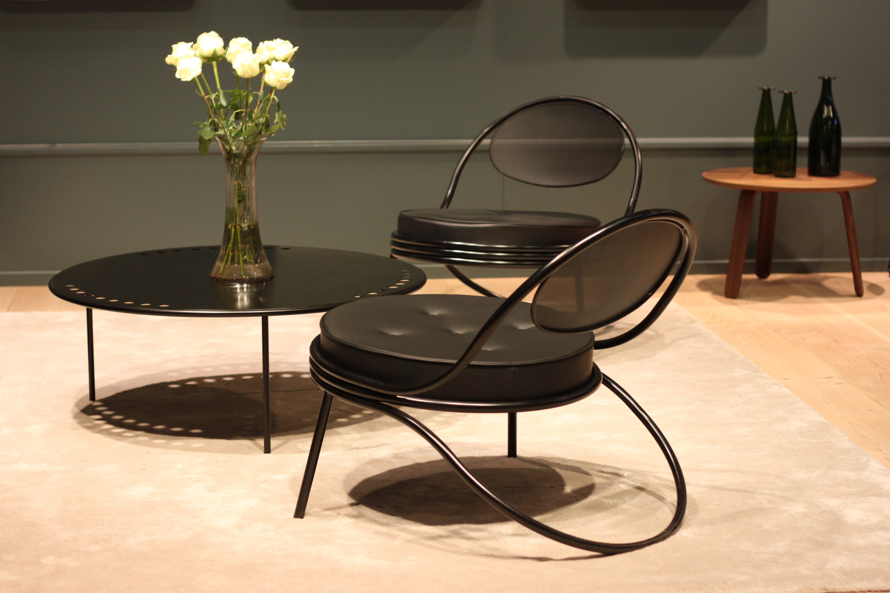 Am Messestand von GUBI wollte man sich am liebsten mit einem schönen Buch häuslich niederlassen, so gemütlich war das dort aufgebaute Wohnzimmer eingerichtet. Besonders begeisterte die wieder aufgelegte Kollektion originaler Matégot-Entwürfe von 1955-1966, die erst einen Tag vor Messebeginn fertig gestellt worden waren. Diese Klassiker, wie der Copacabana Chair & Table, bestehen unaufgeregt und immer noch modern neben allen neuen Möbelstücken ringsherum.