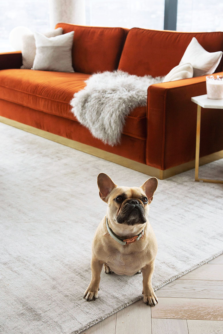 Ob im Büro oder im ihrem stylischen Zuhause in der zweiten Heimat im kanadische Montreal – Lola fühlt sich pudelwohl. Die französische Dogge liebt es in geschmackvoller Umgebung Nickerchen zu machen. Einige besonders gemütliche Ecken, wie das Schafsfell auf dem Sofa oder der Barcelona Sessel vor dem Kamin, hat sie fest für sich beansprucht. Hauptsache kuschelig!
