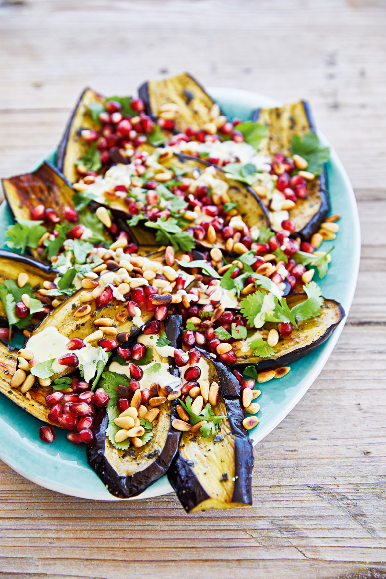 - Zum Servieren die Auberginenscheiben leicht überlappend auf einer großen Platte anordnen. Mit dem Safranjoghurt überziehen, mit den Pinienkernen und Granatapfelkernen bestreuen und großzügig mit den Korianderblättern garnieren.