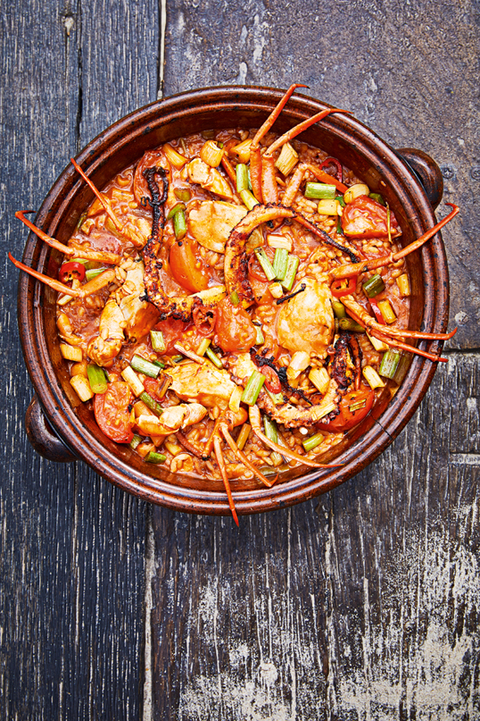 Saftiger Tomaten-Reis im Tontopf mit Tintenfisch und Garnelen