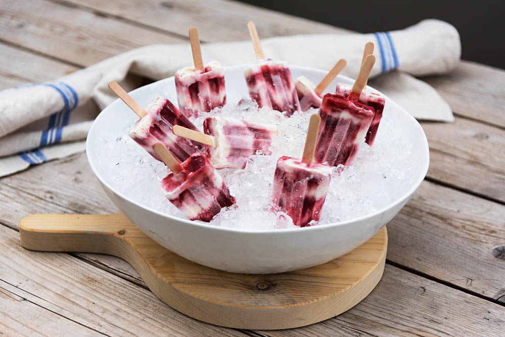 Wasser mit Zucker und Zitronenabrieb zum Sirup aufkochen. Joghurt in den noch warmen Sirup einrühren. Eine Schüssel mit einem Beutel Crushed Ice füllen. Topf hineinstellen und die Masse solange rühren, bis sie erkaltet ist. Mascarpone unterrühren. Erdbeeren waschen, putzen, pürieren und passieren. Puderzucker zugeben. Erdbeermus und Mascarponecreme abwechselnd in Stieleis-Formen geben, anfrieren lassen, Stiele hineinstecken. Mindestens 4 Stunden durchfrieren lassen.