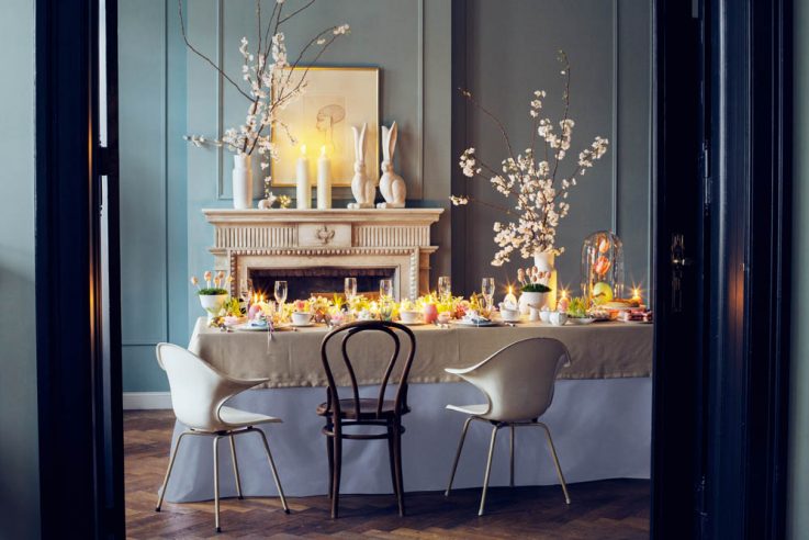 Unter der Blüte der Kirsche „Entweder hat man ein gutes Budget oder guten Geschmack. Letzteres ist mir lieber.“ Mit dieser Devise punktet der freischaffende Floristmeister Björn Kroner auch bei seinem Ostertisch, den er in dem Buch Tischkultur präsentiert. In der Wohnung seiner Nachbarn und Freunde Claudia und Knut in Charlottenburg hat der Autor und Star-Florist