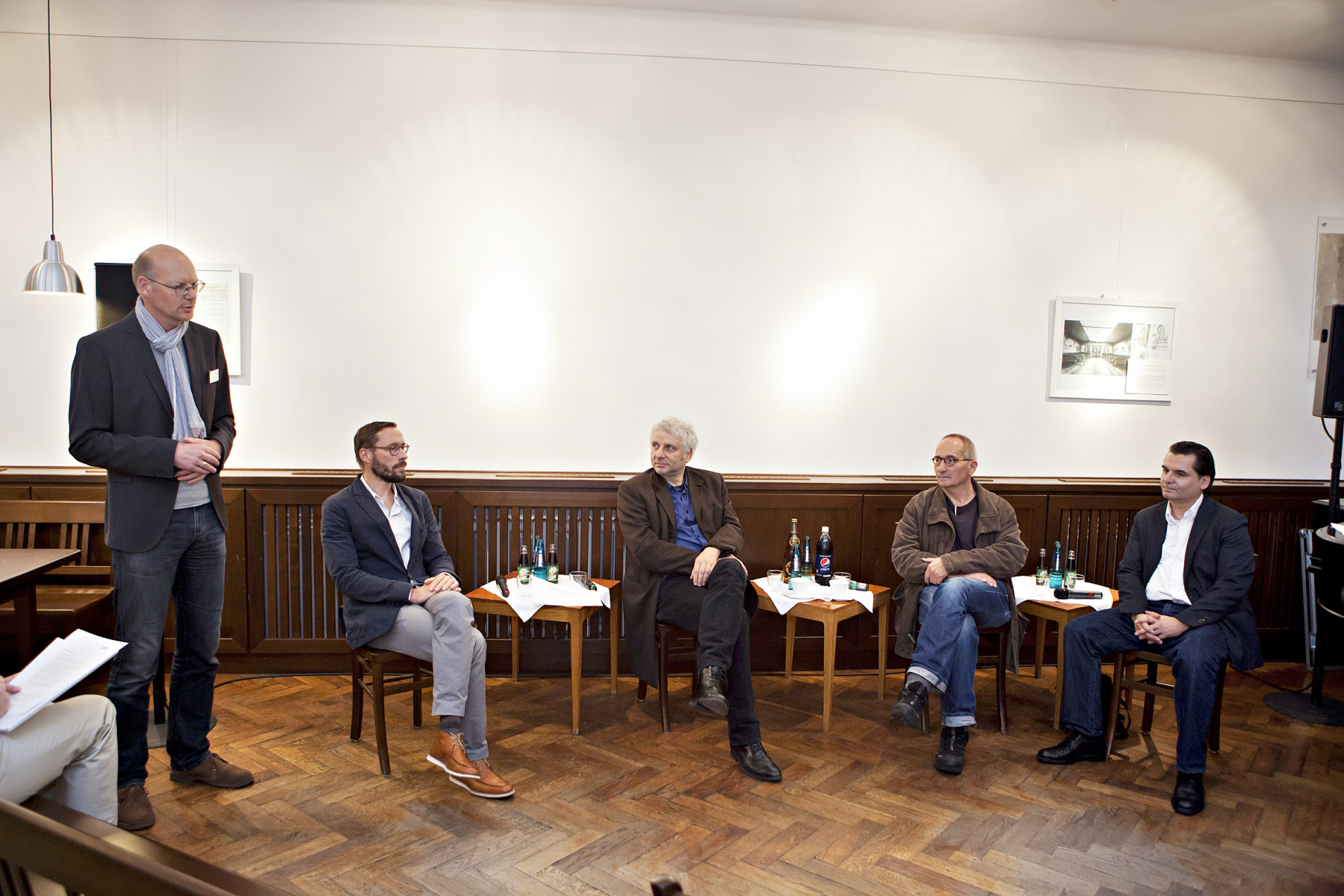 Vor versammelter Lokalpresse stellten die Autoren rund um Tatort-Kommissar Udo Wachtveitl, Alexander Gutzmer, Chefredakteur des Architekturmagazins Baumeister , und den Journalist Guido Walter die Neuerscheinung vor und warfen einen Blick hinter die Kulissen der beliebtesten deutschen Krimiserie. Dominik Graf, der auch beim BR-Tatort vom kommenden Sonntag Regie führte, nahm ebenfalls an der Podiumsdiskussion teil und verriet allerlei spannende Hintergrundinformationen rund um die Auswahl der Drehorte und die Funktion der Architektur in der Kultserie. „Ich habe eine Art Notizbuch im Kopf und sammele ständig neue, potenzielle Drehorte“, so Graf.