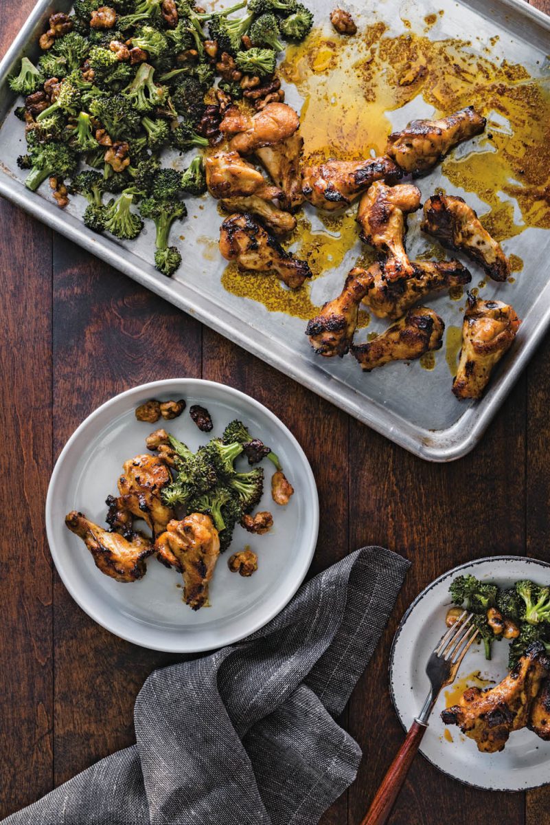 - Die Hähnchenflügel aus der Marinade nehmen (Marinade aufbewahren) und auf eine Seite des Backblechs legen. 20 Minuten im heißen Ofen braten, dann wenden und mit der restlichen Marinade bestreichen. Den Brokkoli auf die andere Seite legen (dabei Platz für die Walnüsse lassen) und 10 Minuten im Ofen garen. Den Brokkoli wenden und die Walnüsse einzeln auf das Backblech legen. Alles weitere 5–8 Minuten garen, bis die Hähnchenflügel knusprig braun, der Brokkoli gabelzart ist und die Walnüsse dunkelbraun sind. Den Brokkoli mit den Walnüssen vermengen und mit den Hähnchenflügeln servieren.