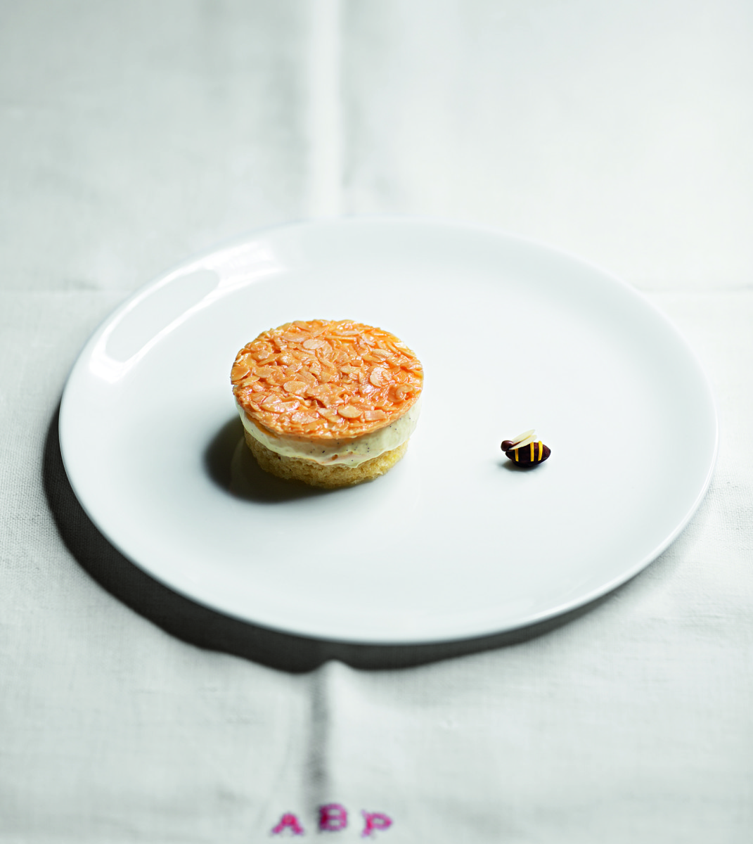 Milch und Butter in einem Topf aufkochen, dann Zucker sowie Pektin einrühren und kochen, bis eine sämige Masse entstanden ist. Die gehobelten Mandeln einrühren, auf eine Silikon-Backmatte gießen, flach streichen und im Ofen bei 160 °C so lange backen, bis die Masse goldbraun ist. Dies dauert etwa 8 Minuten. Anschließend aus dem Ofen nehmen und mit einem Metallring 4 Kreise mit 12 cm Durchmesser ausstechen. Erkalten lassen und bis zur Verwendung trocken lagern.