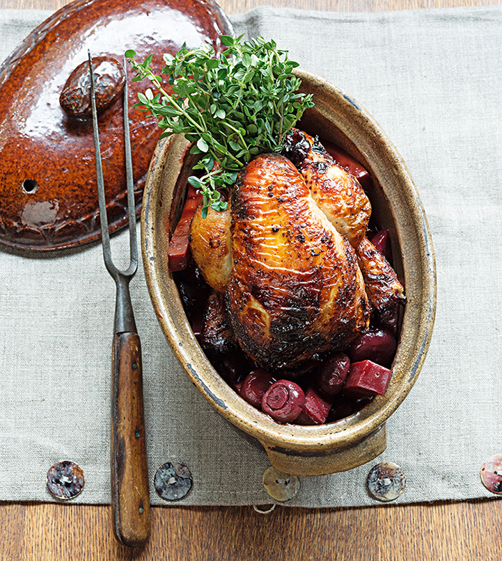 Der französische Bistroklassiker wird von Tim Raue als ganzes Stubenküken serviert, das vorab in einem kräftigen Jus aus Markus Schneiders Rotweincuvée Black Print, Thymian, Lorbeer und Rosmarin saftig gart. Dadurch bekommt es eine betörende, fast schon schwarze Kruste, bleibt innen aber zart rosafarben. Dazu serviert ihr am besten Kartoffelpüree.