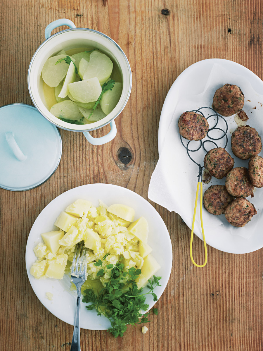 • Die Kartoffeln mit einem Stampfer oder einer Gabel grob zerdrücken, mit Salz abschmecken und mit einem guten Schuss Olivenöl vermischen.