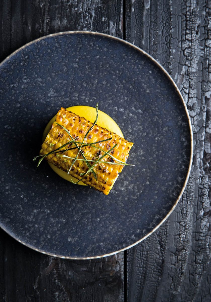in einem kleinen Topf aufsetzen und zum Kochen bringen. Abschäumen und 10 Minuten köcheln lassen. Vom Feuer nehmen, zwei Kaffirlimettenblätter hinzufügen und 10 Minuten ziehen lassen. Die Brühe durch ein feines Sieb in einen Topf abgießen. - Die Maiskörner in die heiße Brühe geben und 10 Minuten köcheln lassen, bis sie weich sind. Noch warm im Mixer bei mittelhoher Geschwindigkeit zu einer glatten Creme pürieren. Salzen, durch ein feines Sieb streichen und beiseitestellen.