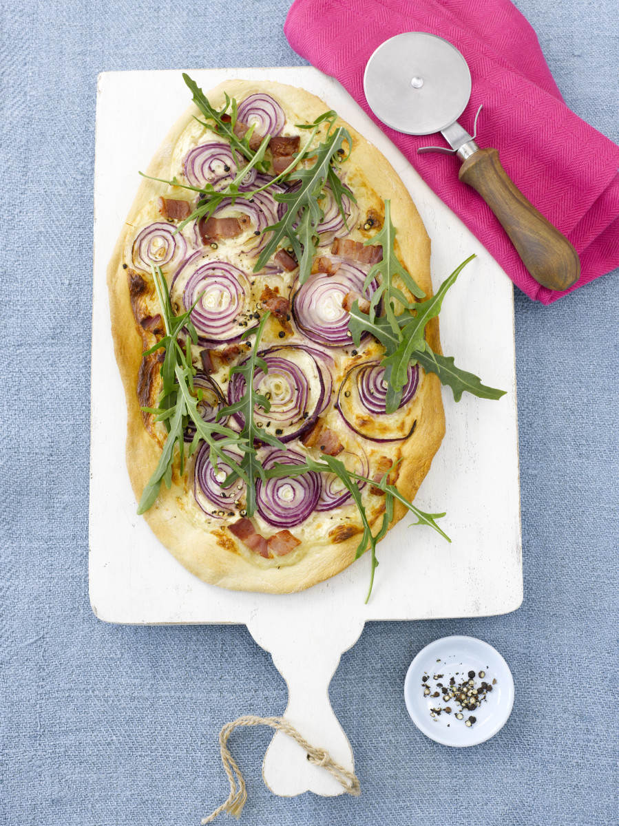 Für den Belag die Zwiebeln schälen und in feine Ringe schneiden. Speck in 2 cm breite Streifen schneiden. Rucola putzen, waschen und in einer Salatschleuder trocken schleudern. Die Alpro Soja-Koch- crème Cuisine mit der Alpro Soja-Joghurtalternative verrühren, mit Salz sowie Pfeffer abschmecken.