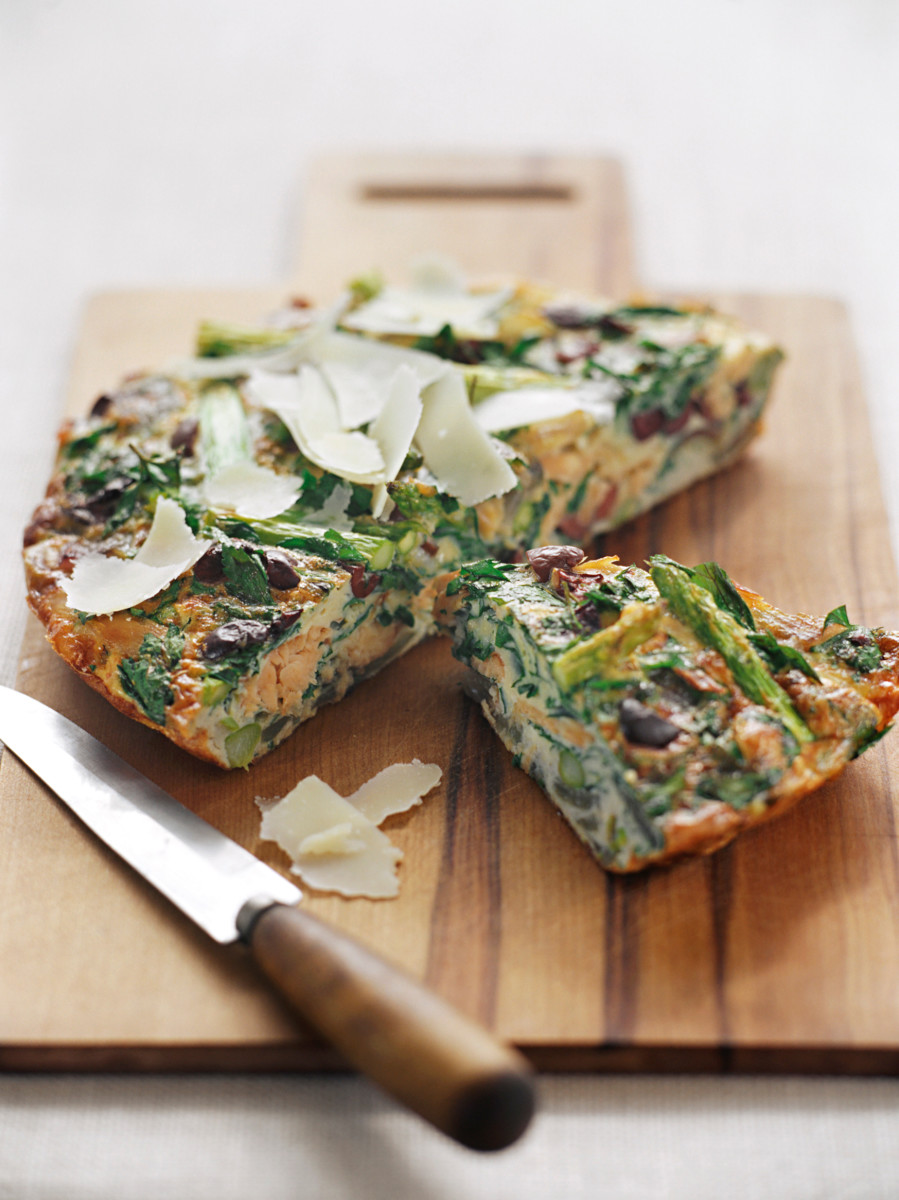 Das untere Drittel vom Spargel schälen, holzige Enden abschneiden und die Stangen in ca. 3 cm lange Stücke schneiden. Diese in heißem Öl in großer Pfanne ca. 5 Min. anschwitzen. Mit Salz und Pfeffer würzen, 1– 2 EL Wasser zugeben und zugedeckt ca. 5 Min. fast gar dünsten. Den Backofen auf 180 Grad Ober- und Unterhitze vorheizen. Währenddessen die Oliven abtropfen lassen und grob hacken. Die Eier mit der Sahne verquirlen, salzen, pfeffern, mit Muskat würzen und die Räucherforelle zerpflücken. Die Kräuter waschen, trocknen und grob hacken. Die Oliven, Forelle und Kräuter gleichmäßig über dem Spargel verteilen und mit der Eiersahne übergießen. Mit etwa der Hälfte Parmesan bestreuen und im Ofen ca. 20 Min. goldbraun fertig backen. Mit dem restlichen Käse bestreuen, in Stücke schneiden und servieren.