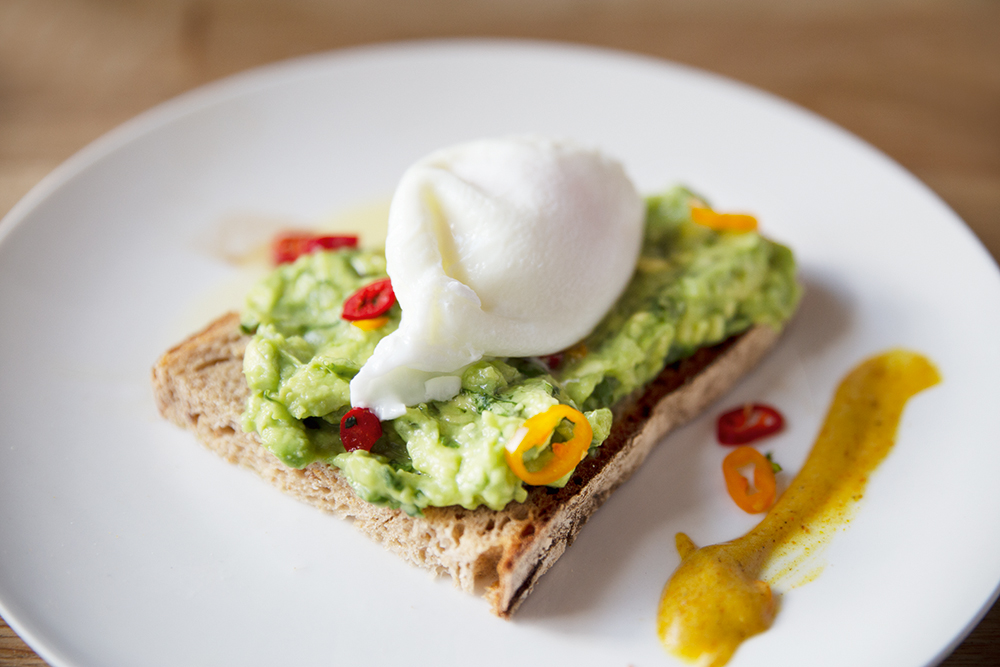 1. Auf ein leicht warm-krosses, frisches Bauernbrot eine Guacamole, bestehend aus Avocados, Zwiebelchen, Zitronensaft, Pfeffer, Salz, Koriander und fein gehackten Tomatenstückchen, streichen.