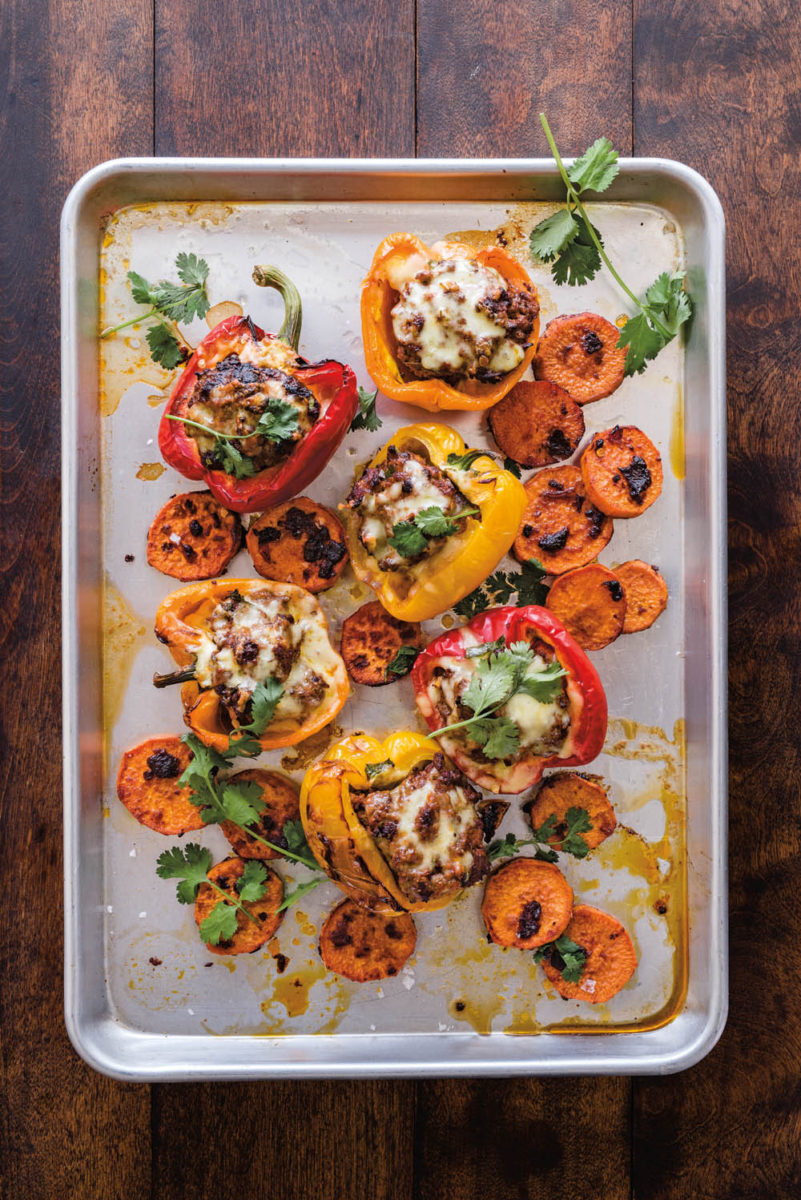 5. Alles 40 Minuten im heißen Ofen garen, bis die Süßkartoffeln karamellisiert und gabelzart sind und das Hackfleisch gar ist. Während der letzten 5 Minuten den Käse über die Paprikaschoten streuen.