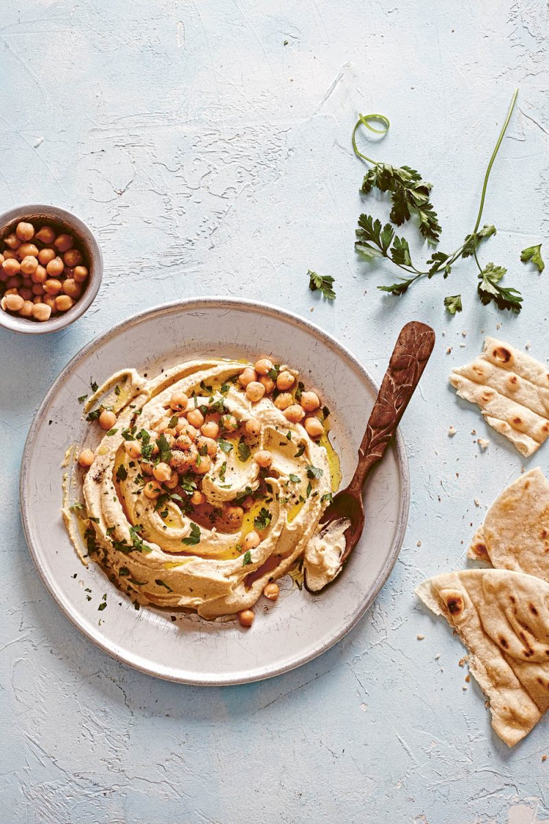 - Den Hummus vor dem Servieren mit 2 EL Olivenöl beträufeln und mit 2 EL ganzen Kichererbsen und evtl. etwas glatter Petersilie garnieren.
