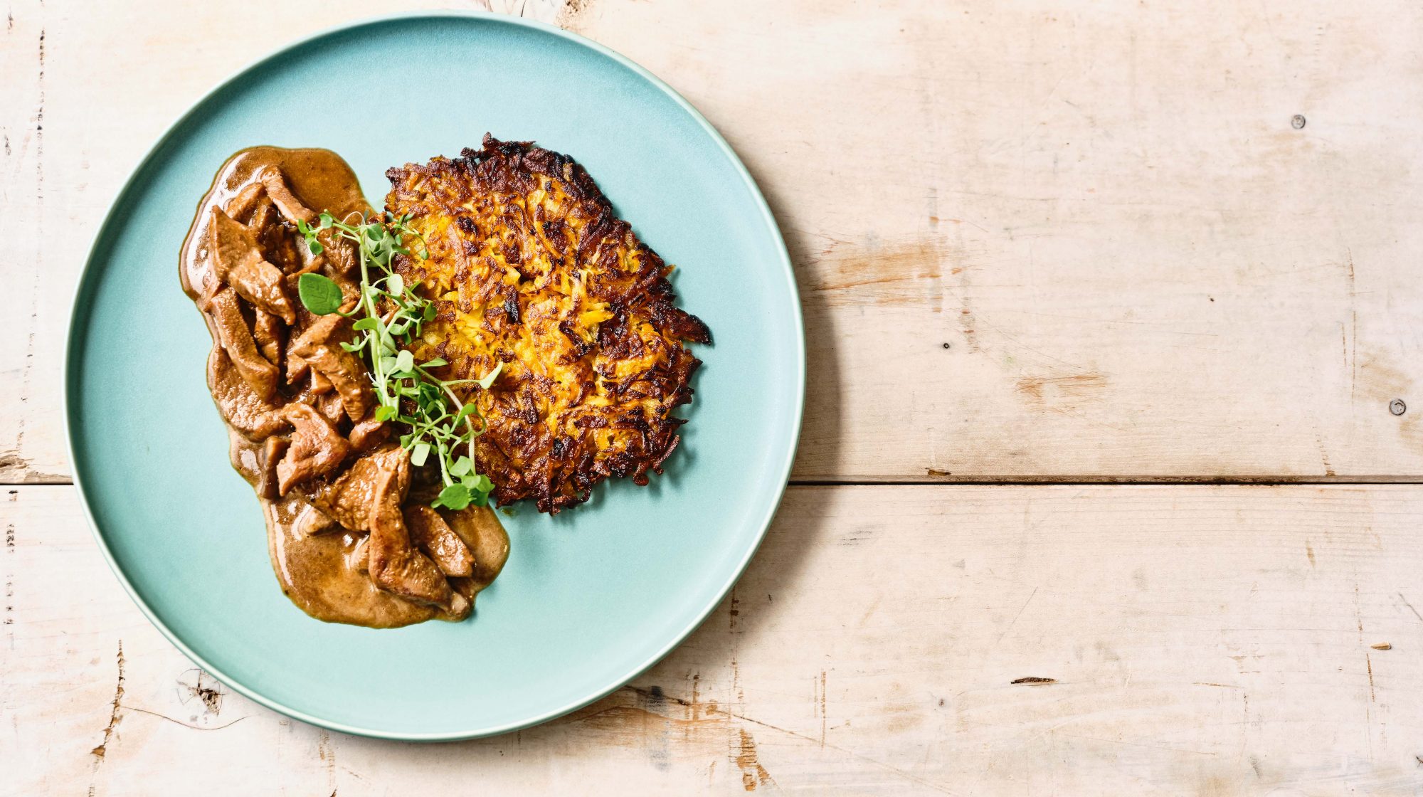 Das Geschnetzelte mit viel Sauce auf den Teller geben, daneben den Rösti anlegen und mit Vogelmiere garnieren.