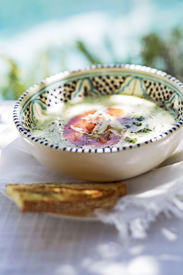 Nichts erfrischt im Sommer so schön wie eine Gazpacho, also kalte Suppe. Zu diesem sommerlichen Rezept ließ sich Spitzenkoch Franz Keller von der Küche Zyperns inspirieren, genauer gesagt, von der regionalen Küche Limassols, der zweitgrößten Stadt der Insel. Keine Ahnung, ob es im griechischen auch ein Wort für „kalte Suppe“ gibt. Fakt ist, ebenso wie die klassische Gazpacho andaluz kommen auch hier Gurken, Tomaten, Olivenöl und Brot zum Einsatz und, wen verwundert es, garniert wird die zypriotische Variante natürlich mit geraspeltem Halloumi. Kali orexi !