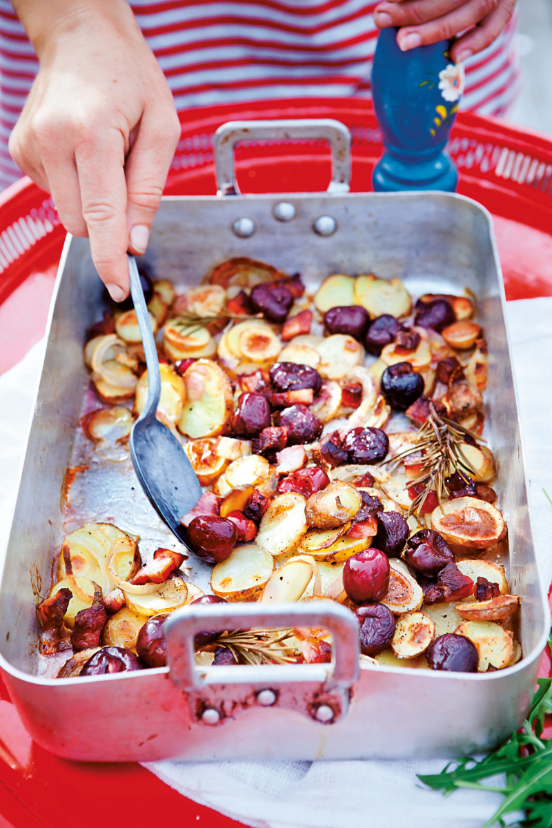 In drei Tagen ist Sommeranfang. Und damit auch Kirschenzeit. Mit diesem Kartoffelauflauf aus Lisa Lemkes Sommerküche können Liebhaber der heißen Jahreszeit frönen und in deftiger Küche schwelgen: Kartoffeln, süße Kirschen, gepökelter Räucherspeck und frischer Rosmarin werden in einer Form geschmort. Das bereitet keinen großen Aufwand und schmeckt himmlisch.