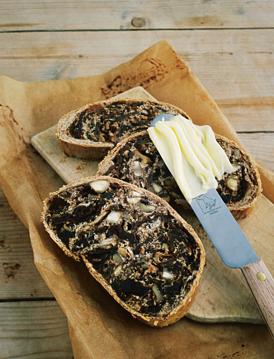 Für den Teig Mehl und Salz mischen. Hefe, Butter und Milch verrühren und mit dem Mehl verkneten, bis der Teig nicht mehr klebt. Mit einem Tuch zudecken und an einem warmen Platz gehen lassen, bis sich das Teigvolumen verdoppelt hat. Den Teig kurz durchkneten, ein Drittel des Teiges zu einer Kugel formen und weiter gehen lassen. Den Rest mit der vorbereiteten Füllung sehr gründlich verkneten – mit der Hand dauert das mindestens 15 Minuten. Mit einer Küchenmaschine mit Knethaken geht es etwas schneller.