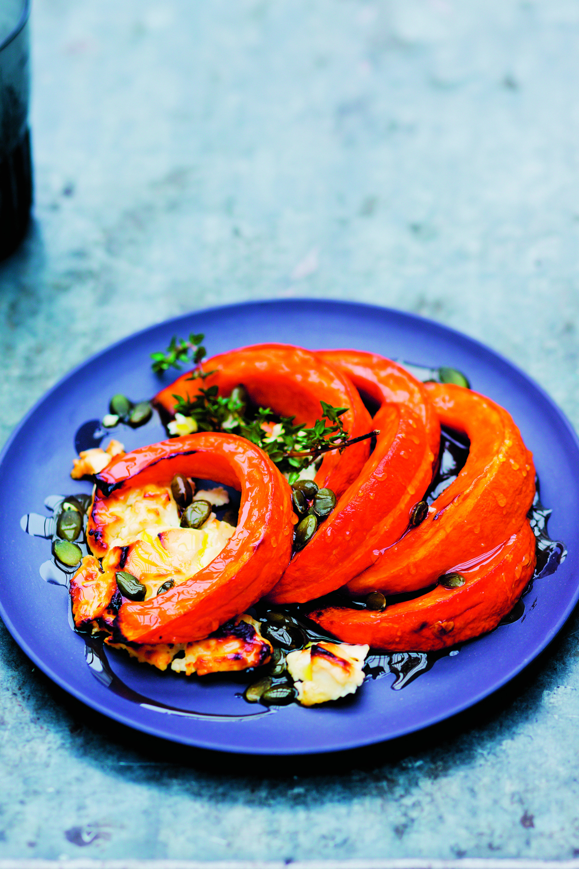 Die Thymianblättchen abzupfen und in einer kleinen Schale mit Honig und Olivenöl vermischen. Die Fetascheiben und die Kürbisspalten auf ein mit Backpapier ausgelegtes Backblech legen und mit der Honigmischung bestreichen. Salzen und pfeffern. Kürbis und Feta 20 Minuten in den Ofen schieben. Mit Kürbiskernen bestreuen und heiß servieren.