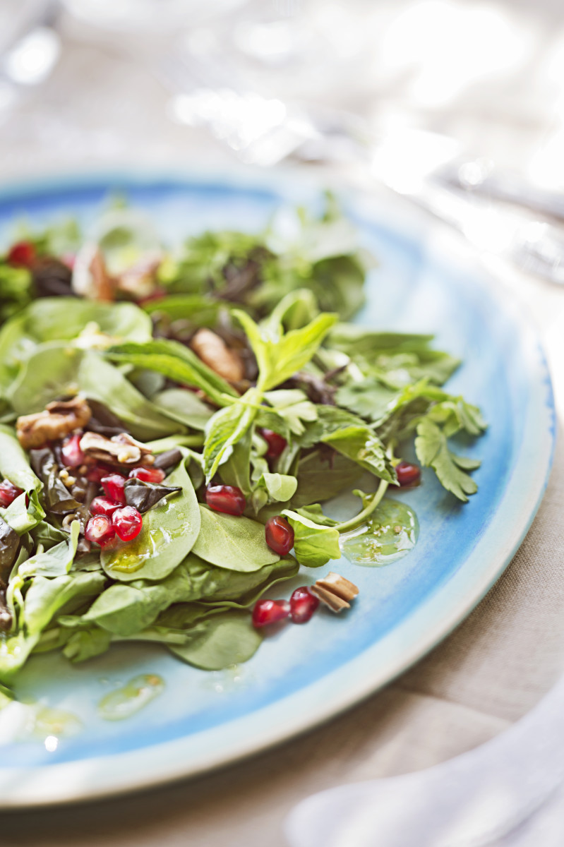 Minze, Kapern, Walnuss- und Granatapfelkerne darüber verteilen. Alle Zutaten für das Dressing verrühren. Kurz vor dem Servieren den angerichteten Salat damit beträufeln.