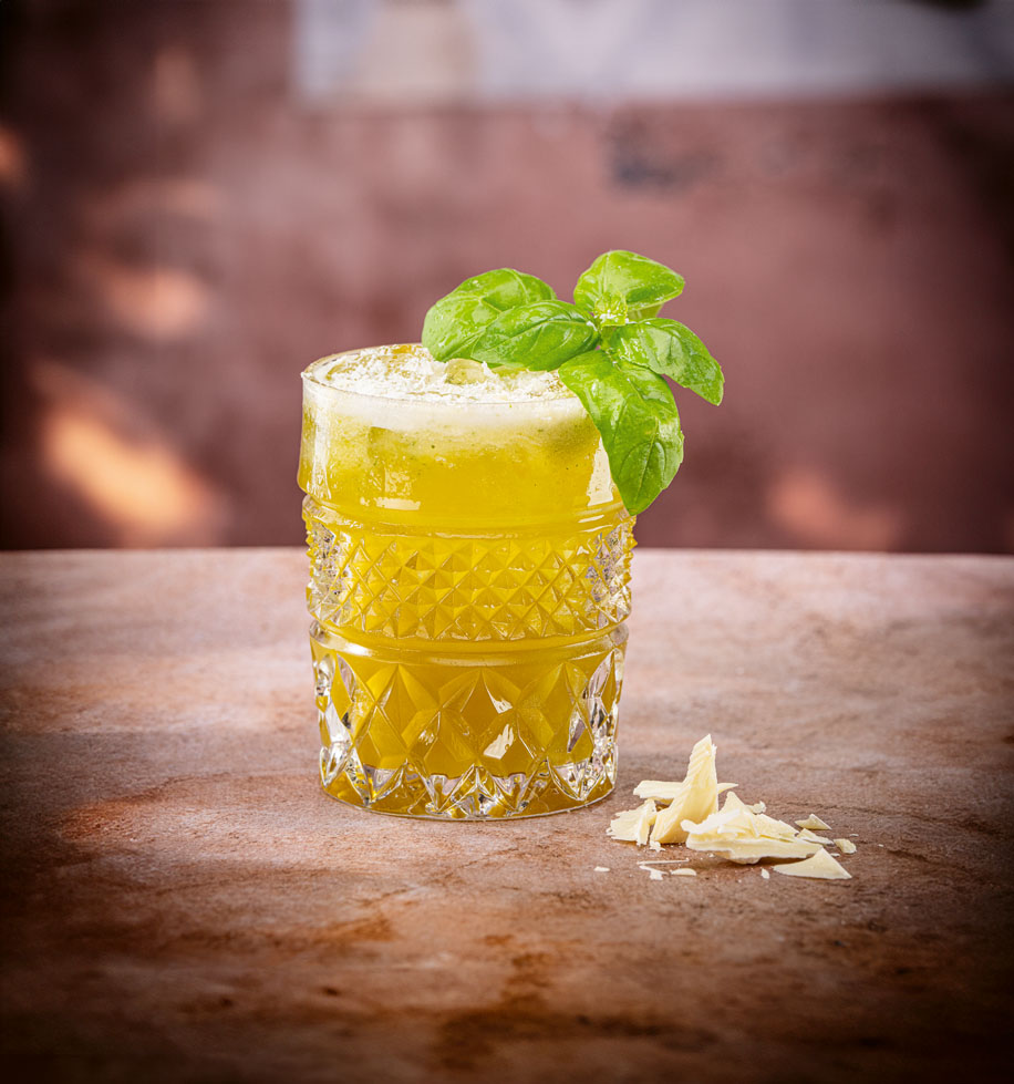 Alle Zutaten in einem Shaker mit Eiswürfeln kräftig und lange shaken. Doppelt in einen Tumbler mit Eiswürfeln abseihen. Mit Basilikum, weißer Schokolade und Chilifäden dekorieren.