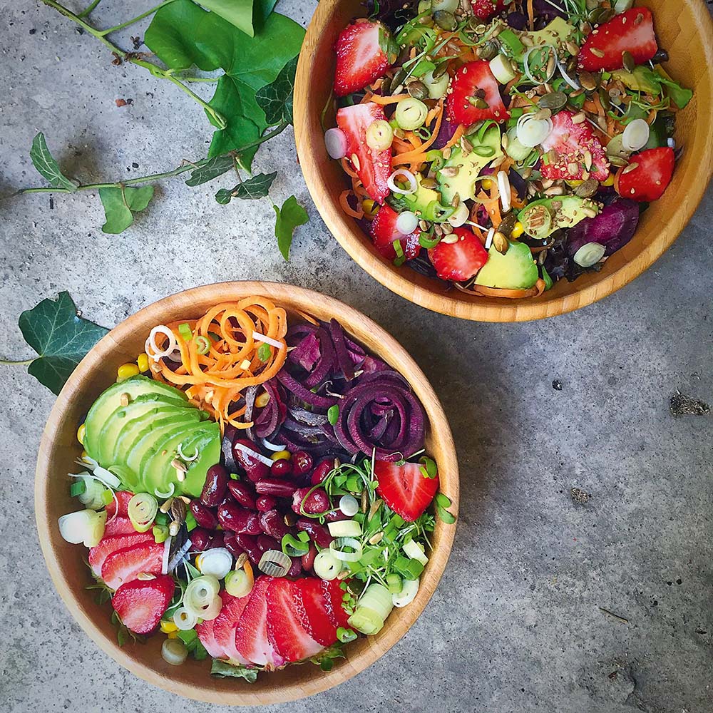 Ist es mir mal nach etwas Leichterem zumute, verzichte ich auf die Kidneybohnen und ersetze sie durch Heidelbeeren. Prinzipiell kann die Sommer-Bowl, wie auch die anderen Bowls, nach Herzenslust verändert werden. Mit ihrer schnellen Zubereitung und Vielfalt zählt sie zu meinen Lieblingsbowls. Um genau zu sein, steht sie sechs bis siebenmal die Woche, mit Obst und Gemüse der Saison plus Hülsenvariation, auf meinem Tisch.
