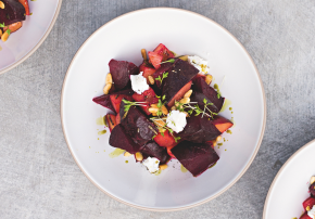 Rote Bete entfaltet im Ofen ihr volles Aroma: erdig, leicht süß und intensiv. Zusammen mit Rosmarin und einem Hauch Orange entsteht die aromatische Basis dieses Salats, während saftige Pflaumen eine fruchtige Note hinzufügen. Ziegenfrischkäse und geröstete Pinienkerne sorgen schließlich für Cremigkeit und Biss – ein ebenso unkompliziertes wie elegantes Gericht, das als Beilage oder auch Hauptgericht funktioniert.