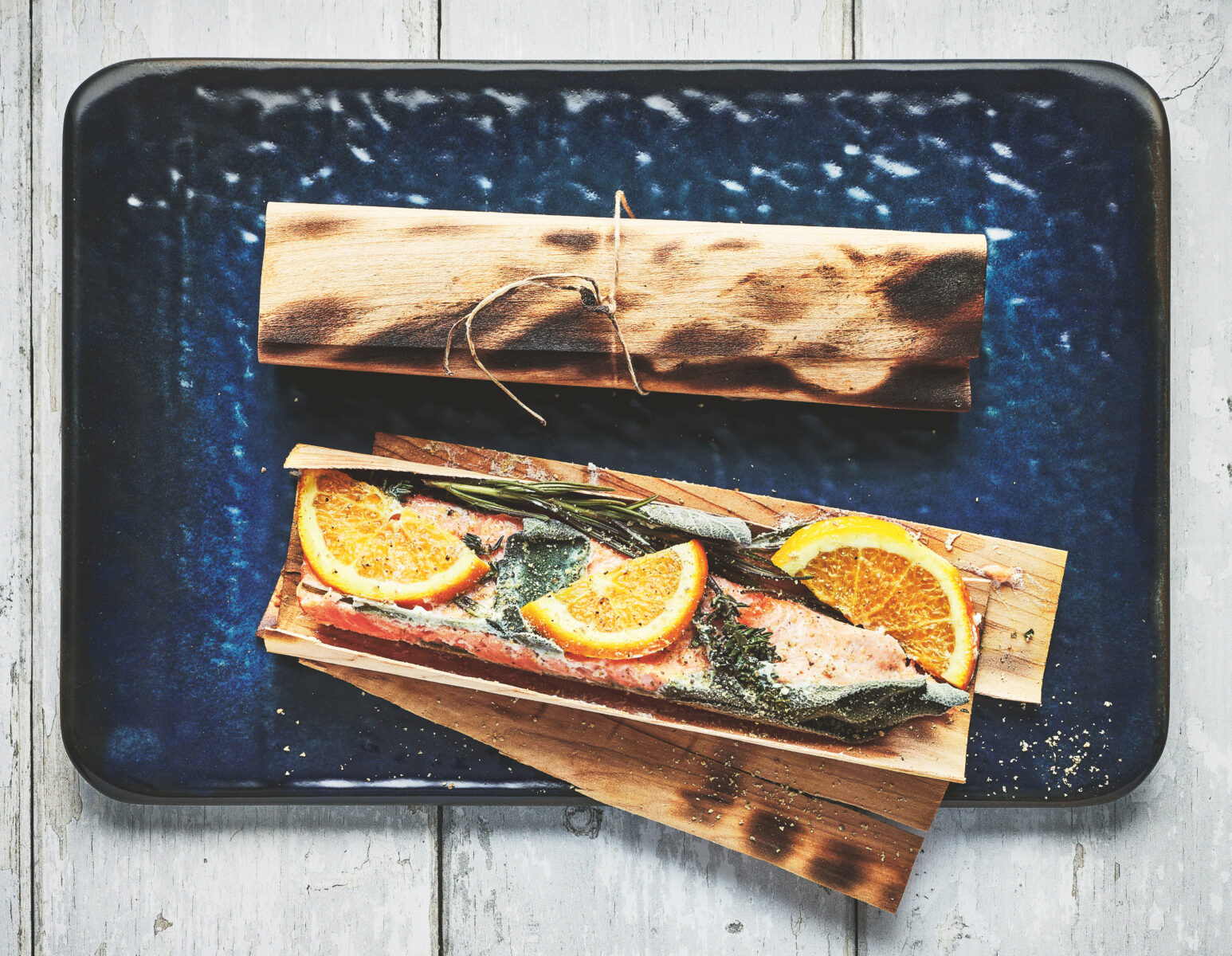 Die Kirschrinde über Nacht in kaltem Wasser einwei- chen. Vom Lachs die Haut abziehen und das Filet in 4 Teile schneiden. Anschließend die Lachsstücke mit Rosmarin, Thymian und Salbei auf die Kirschrinde legen. Mit Orangenscheiben belegen. Mit Salz und Pfeffer würzen und mit Cointreau übergießen. Die Päckchen verschnüren und bei indirekter Hitze mit viel Rauch im Big Green Egg bei 140 °C ca. 10 Minuten garen.