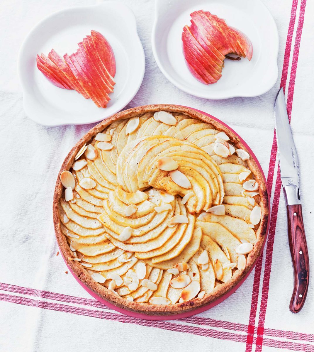 - Apfelstücke in Rosettenform von außen nach innen laufend auf dem Teig anordnen. In die Mitte (zur Erhöhung) die kleinen Endstückchen legen. Für die obere Reihe die Apfelscheiben jeweils fächerförmig versetzt auflegen. Für den Guss den Agavensirup und die Butter in einem kleinen Topf kurz aufkochen und die Apfelstücke mit einem Pinsel damit bestreichen. Um den äußeren Rand herum nach Belieben die Mandelblättchen streuen. Den Kuchen 20–25 Minuten auf der mittleren Schiene im Ofen backen. Vor dem Servieren abkühlen lassen und mit Puderzucker bestreuen.