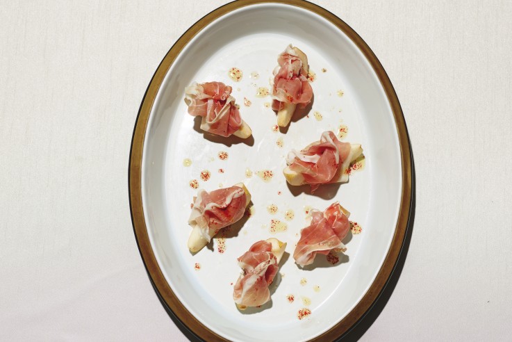Zart geschnittener San-Daniele-Schinken trifft auf saftige Corella-Birnen und ein fein aromatisiertes Zitronen-Rosa-Pfeffer-Öl – eine elegante Komposition, die mit wenigen Zutaten und klaren Aromen überzeugt und sich ideal als raffinierter Auftakt oder leichter Zwischengang eignet. San Daniele, Corella-Birnen, Zitroniges Rosa-Pfeffer-Öl Für 6 Personen ZUTATEN 20 g rosa Pfefferkörner 90 ml Zitronen-Olivenöl 2 reife Birnen (Sorte Corella)