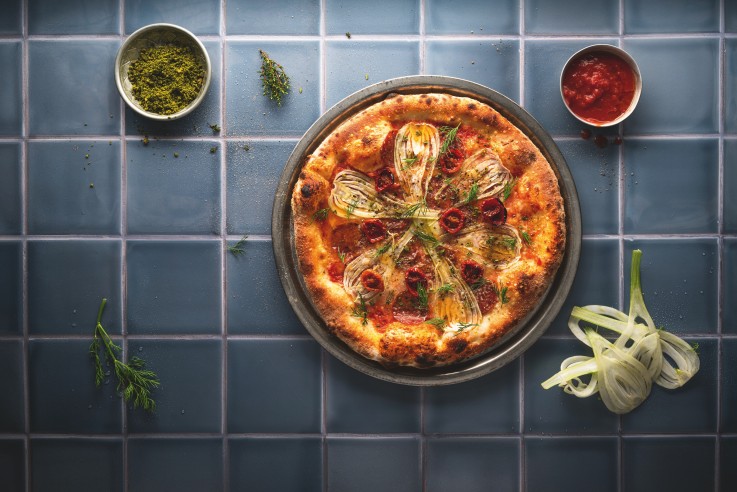 Fenchel und Fenchelsalami prägen den klaren, mediterranen Charakter dieser Pizza. Fior di latte und Parmesan sorgen für eine ausgewogene Basis, während die feinen Fenchelscheiben Frische und Struktur einbringen. Zitronensaft, Honig und konfierte Kirschtomaten setzen zum Servieren gezielte Akzente und runden das Gesamtbild harmonisch ab. Pizza Salamia mit Fenchel und Fenchelsalami ZUTATEN PIZZA 70 g Tomatensauce