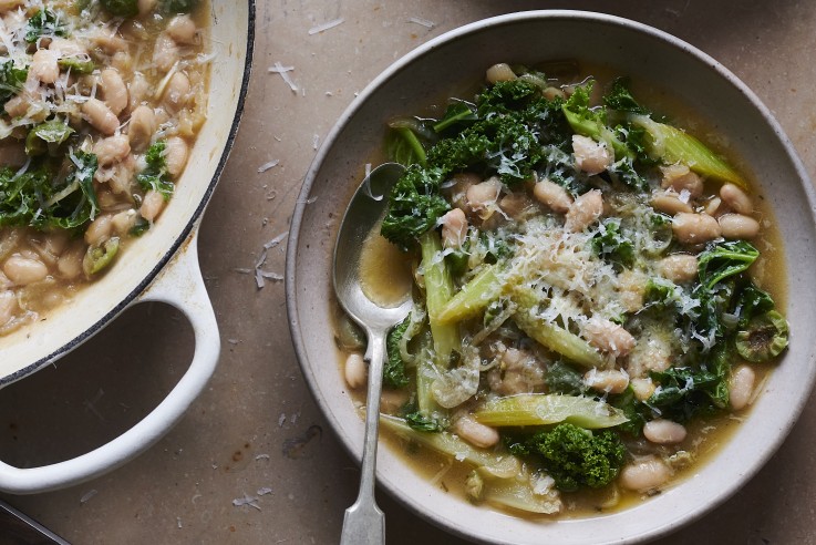 Diese Suppe vereint kräftige Bohnen, frischen Grünkohl und feine mediterrane Aromen zu einem unkomplizierten Wohlfühlgericht. Zitrone, Oliven und Salbei setzen leichte Akzente, während Pecorino für Tiefe sorgt. Eine ausgewogene Kombination, die an kühlen Tagen ebenso überzeugt wie als aromatische Alltagsküche. SUPPE MIT GRÜNKOHL UND WEISSEN BOHNEN ZUTATEN: 100 ml Olivenöl 2 Zwiebeln, in Scheiben geschnitten