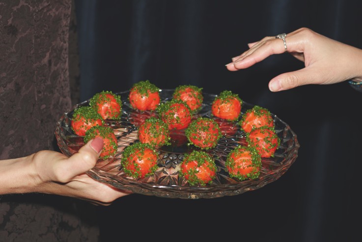 Diese kleinen Geschmacksbomben, inspiriert von einem klassischen Sepia-Kanapee, sind wirklich gut. Es dauert zwar ein wenig, bis man die Technik beherrscht, sie zu perfekten Kugeln zu formen, aber wenn man sie einmal gemacht hat, muss man sie nur noch servieren und spart am Abend Zeit. Mit Schnittlauch umwickelt und mit Crème fraîche und Meerrettich gefüllt,