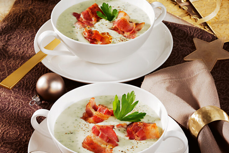 Suppen lassen sich gut vorbereiten, wärmen kleine Eiszapfen auf und kommen als Mittagessen oder abends als Vorspeise auf den Tisch. Salate machen all die reichhaltigen Leckereien eine Spur leichter! Die Petersilienwurzel wird in Mittel- und Nordeuropa ab Oktober geerntet und kann zu Suppenund Pürees verarbeitet oder als Gemüsebeilage gegessen werden. Petersilienwurzelsuppe mit Speck ZUTATEN FÜR