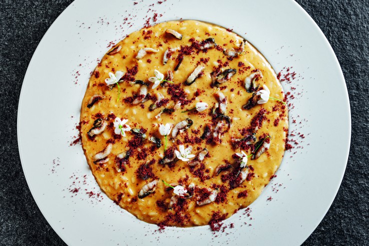 Dieses Risotto verbindet cremige Textur mit feinen Rauchnoten und einem Hauch von Säure. Der zarte Aal trifft auf die dichte Struktur des Carnaroli-Reises, unterstützt von butteriger Fülle und einer würzigen, leicht zitronigen Nuance. Eine Komposition, die klassische Technik mit subtilen Akzenten vereint und zugleich Raum für die reine Aromatik der Zutaten lässt. RISOTTO MIT GERÄUCHERTEM