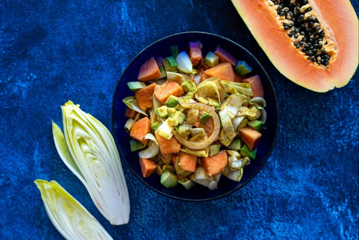 Das Auge isst bekanntlich mit. Wir haben einen Salat, der nicht nur in Pastellfarben erstrahlt, sondern auch eine wahre Geschmacksexplosion ist. Ob als Brunch oder als leichter Lunch, er ist auf jeden Falls ein Genuss fürs Auge und Gaumen. Lass euch überraschen! Avocado-Papaya-Chicorée-Salad ZUTATEN (Dressing): 1 TL Dijonsenf 1 EL Tamari 1 EL Zitronensaft 2