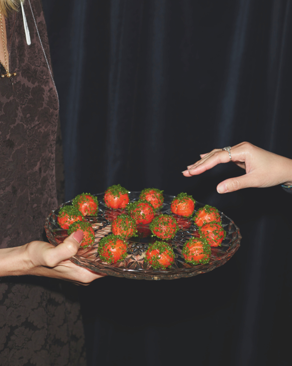 Die Lachsbällchen aus dem Kühlschrank nehmen und mit Olivenöl bepinseln. Die Bällchen in Schnittlauchröllchen wälzen und vorsichtig auf Serviertellern anrichten.