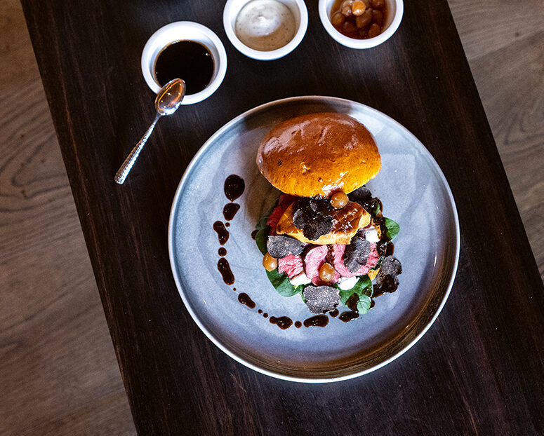 Zum Anrichten die Brioche-Buns längs aufschneiden, toasten, die restlichen Zutaten noch einmal kurz erwärmen und, wie auf dem Bild gezeigt, anrichten. Zum Schluss den Trüffel drüberhobeln.